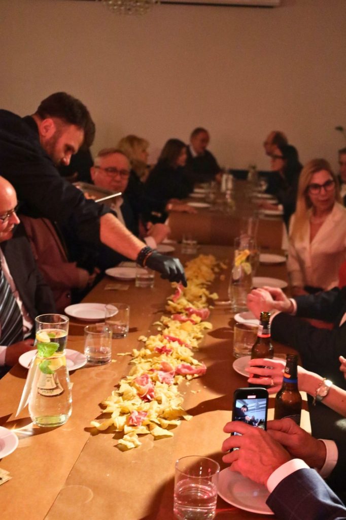 Na stołach gości kolejno pojawiały się Tapasy: manchego / dulce de membrillo, tortilla de patatas, ensalada rusa, asparragos / gambas / majonesa / pimentón ahumado, patatas bravas / aioli, pintxo bacalao, pintxo atún / huevo / oliva / majonesa. Tu sommelier serwował wino Heraclio Macabeo – Sauvignon Blanc.