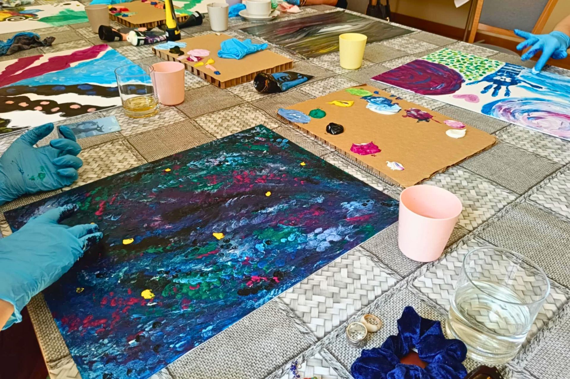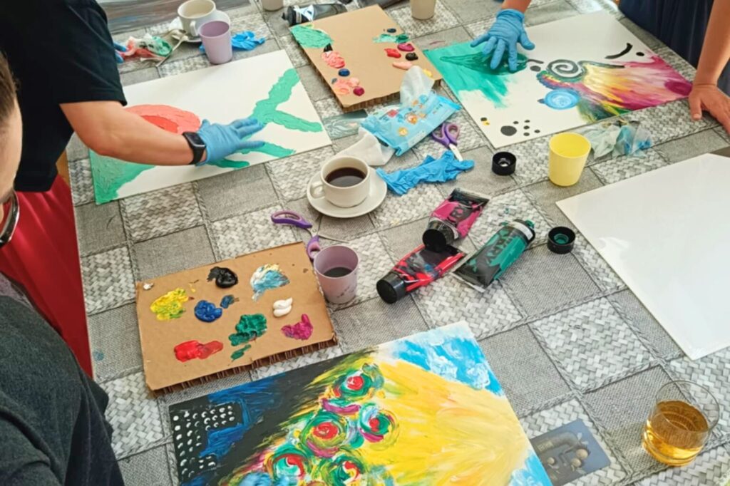Warsztaty arteterapeutyczne dla kobiet w Dworze Skrzynki, które odbyły się w minioną sobotę 5 lipca, poświęcone były tematowi intuicji. Prowadząca Marta Szostak, wraz z uczestniczkami zastanawiała się, skąd bierze się w nas głos intuicji, czym on jest i jak za nim podążać. Obrazy, które powstawały w ramach twórczego działania, malowane były jedynie przy użyciu farb i dłoni. Dzięki temu cały proces z jeszcze większą mocą mógł być odbierany przez zmysły, a dosłowne nadawanie kształtu swojemu obrazowi wzmacniało poczucie sprawczości i inspirowało do podążania za wewnętrznym kompasem. Kolejne warsztaty 23 sierpnia pt. Zatrzymane w locie. O słuchaniu siebie / rysunek węglem – serdecznie zapraszamy! Warsztat w dużej części odbywać się będzie w ciszy – bez rozmów, z uważnością na sygnały z ciała i emocje. W tej wyjątkowej atmosferze uczestniczki tworzyć będą węglem, poszukując przy tym odpowiedzi na pytanie – Co we mnie dziś chce przemówić? Jakich sygnałów nie wyłapuję, jakiej wiedzy na swój temat staram się uniknąć? Co mówi do mnie moje ciało, kiedy w końcu pozwalam mu się zatrzymać? Jeśli pogoda na to pozwoli, zajęcia odbędą się w dworskim parku.