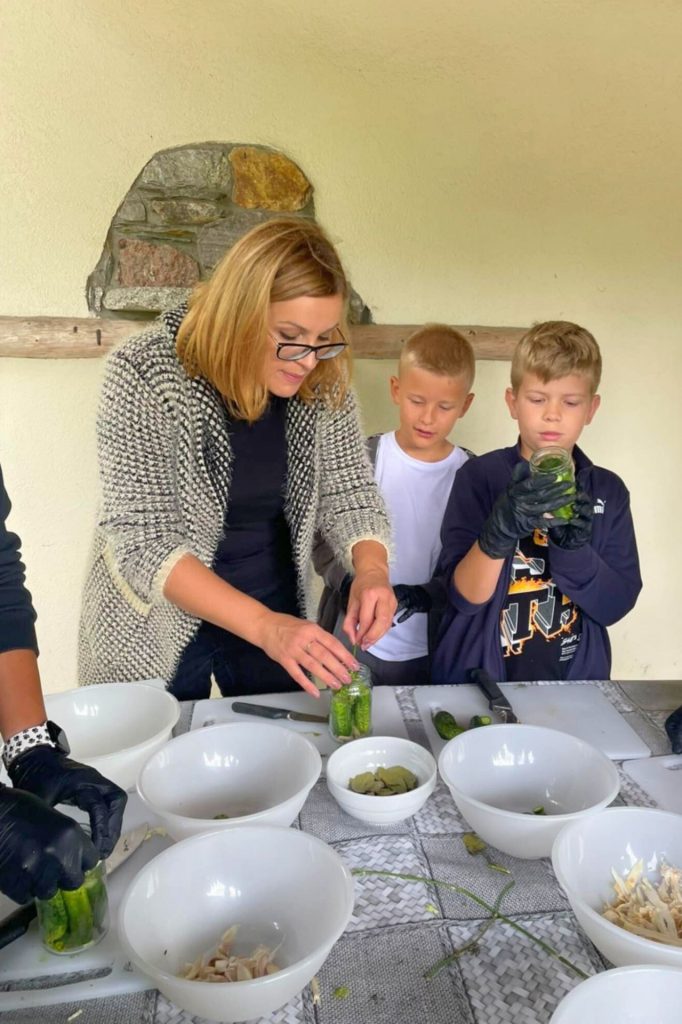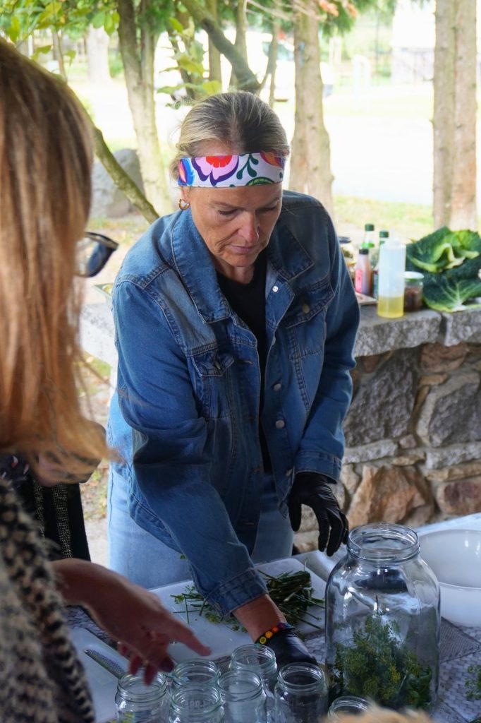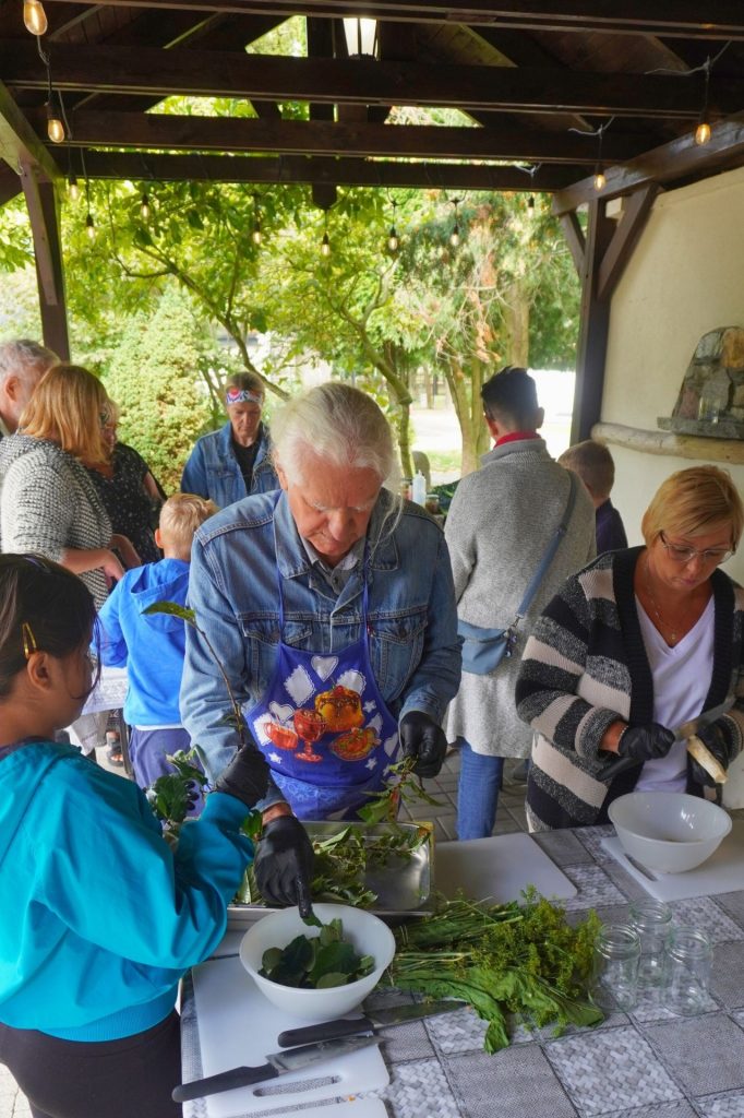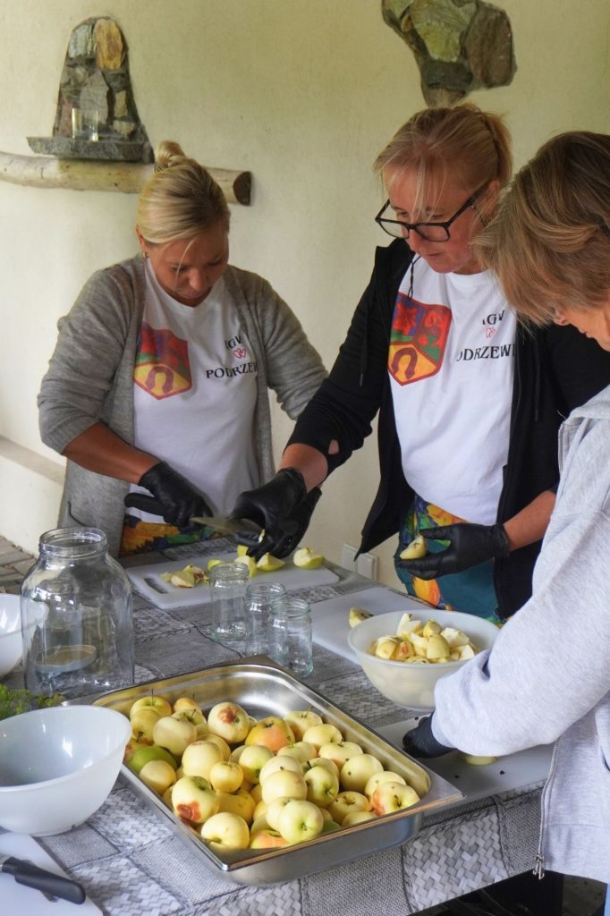 Ponieważ kolejne spotkania: warsztaty 20.09.2025 z plyndzami i zimnymi nóżkami na czele oraz pokaz kulinarny i degustacja podczas festynu rodzinnego „Skrzynki Pełne Smaków” 21.09.2025 r., uczestnicy sobotniego spotkania przygotowali także dodatek do zimnych nóżek (czyli galartu) ocet jabłkowy pod okiem ekspertów, Ewy i Piotra Michalskich, kucharzy osobistych z Puszczykowa, którzy zaskoczyli uczestników, że ocet można przygotować także z kwiatów i ziół, np z nawłoci). Chętnie odpowiadali na pytania dotyczące octów i przetworów, które panie z kół gospodyń wiejskich obecne na spotkaniu planują wykorzystać przy kolejnych kulinarnych zmaganiach.